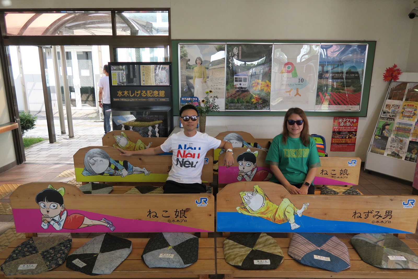 沿水木茂之路行,你會不斷拎部相機出黎影相,因為真係不斷有關於妖怪既野出現。我地已經冇咩入去商舖睇野,但都行左四十五分鐘先去到水木茂紀念館。係紀念館旁,有間妖怪食品研究所,我見黎親境港既人,都會幫襯買一對鬼眼麻糬。大家旨在放對鬼眼麻糬係自己塊面影相。